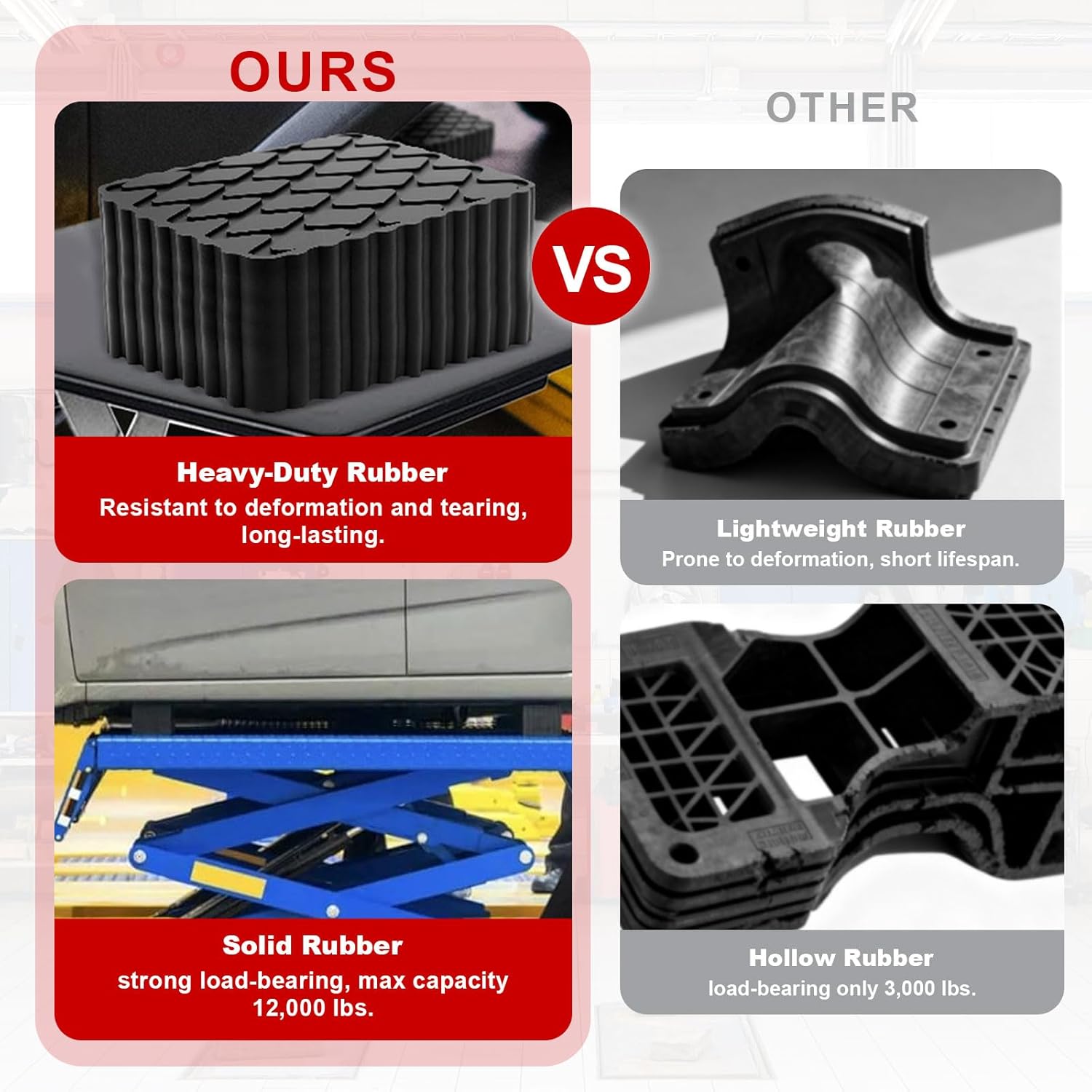Protect your vehicle and ensure a smooth, secure lift with our Heavy-Duty Rubber Jack Pad, engineered for maximum durability, stability, and damage prevention during every lift.Features:Strong natural rubber, high wear and tear resistance.Supports up to 12,000 lbs for reliable lifting.Textured top and smooth bottom for stability.Protects rocker panels and steps from damage.Compatible with low-rise, rolling, and inground lifts.Specifications:- Material: solid polyurethane rubber- Size: 6-3/8" x 4-3/4" x 3"Package Includes:4 x rubber jack padUpgrade your lifting experience today with this must-have, long-lating jack pad!