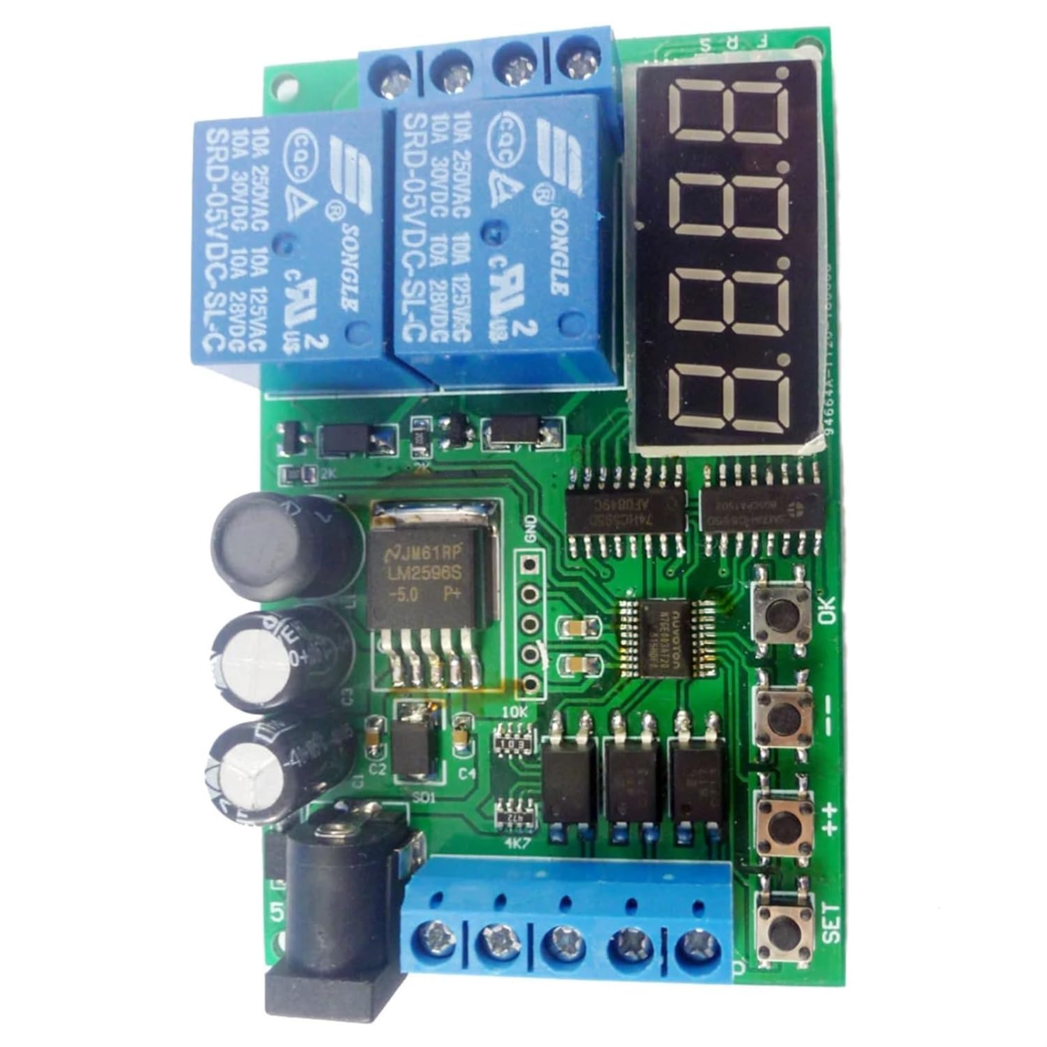 DC6.5-25V Cycle Delay Relay Module 0.1s-9999min Adjustable Time Control Switch Multifunctional Motor Forward Reverse ControllerFeatures:1. Dual power supply (two power supplies cannot be powered at the same time): Power supply 1, 6.5-25V; Power supply 2, 5V.2. Working current: (Normal Mode) standby current 41mA, working current 83mA; (Energy-Saving mode) Standby current 7mA, working current 44mA.3. There are three input control port: forward control(FWD), reverse control(REV), and stop control(STOP).3. Two input trigger modes, Low-Pulse trigger mode, Low-Level trigger mode.4. Delay time: 0.1-999.9 seconds, 1-9999 seconds, 1-9999 minutes. Cycle times: no cycle, 2-99 cycles, always cycle.5. Three indicators: forward indicator(F LED), reverse indicator(R LED), stop indicator(S LED).6. Relay load current, recommended less than 5A.7. This is a multi-function DC/AC motor forward and reverse controller with multiple control modes. Many control functions can be derived through reasonable settings.Specification:Power Supply: 6.5-25V, 5VWorking Current: 83mAStandby Current: 41mA<;5ADelay Time: 0.1-999.9 Seconds, 1-9999 Seconds, 1-9999 MinutesSize: 8*5cm/3.2*2inWeight: Approx. 51g/1.8ozPort: 5.5 Female: Power supply 1, 5V power supplyVIN: Power 2 positive, 6.5-25V power supplyGND: Power supply 2 negativeFWD: Forward input control (partial Function-Mode is invalid)REV: Reverse input control (partial Function-Mode is invalid)STOP: Stop input control (partial Function-Mode is invalid)M+: Motor positiveM-: Motor negativeP+: Positive terminal for motor power supplyP-: Negative terminal for motor power supplyTimer:T1: Forward TimerT2: Reverse TimerT3: Stop TimerTime Unit : 0.1 Second, 1 Second, 1 MinuteRelay Action:Motor Forward: Relay 1 is ON, relay 2 is OFF, and the F LED indicator is flashing.Motor Reverse: Relay 1 is OFF, relay 2 is ON, and the R LED indicator is flashing..Motor Stop: Relay 1 is OFF, relay 2 is OFF, and the S LED indicator is flashing. Settings:Press the "++" and "--" buttons simultaneously for 5 seconds.Energy-saving mode:Press and hold the "OK" button for 5 seconds to enter the "Energy-saving mode". Press and hold the "OK" button again for 5 seconds to exit the "Energy-saving mode". Energy saving mode just turns off the digital tube and LED indicator, and other functions are normal.Function mode:F-01After power-on, the motor is forward T1 time; then the motor stops T3 time; then the motor reverse T2 time; so it is repeated Nx times. When the STOP port is triggered, the motor stops working immediately. (FWD, REV port is invalid)F-02This function is a F-01 variant. F-01 is run directly after power-on, but F-02 needs to trigger FWD or REV port to run.F-11(Trigger Reversible 1)Trigger the FWD port, the motor is forward T1 time, and automatically stops (in order to protect the motor, during the delay period, trigger the REV port to stop T3 time and then reverse T2 time, trigger FWD port to re-time T1).Trigger the REV port, the motor is reverse T2 time, and automatically stops (in order to protect the motor, during the delay period, the FWD port is triggered to stop the T3 time and then the T1 time is forward, and the REV port is re-timed T2).When the STOP port is triggered, the motor stops immediately, regardless of whether the motor is forward or reverse.F-12(Trigger Reversible 2)Trigger the FWD port, the motor is forward T1 time and stops automatically (during the delay period, except for triggering STOP port, the other ports are invalid).Trigger the REV port, the motor is reverses T2 time, and automatically stops (during the delay period, except for triggering STOP port, the other ports are invalid).When the STOP port is trigger, the motor stops immediately, regardless of whether the motor is forward or reverse.F-21When the FWD port is low level, the motor is forward, and after the FWD port is released, the motor stops.When the REV port is low level, the motor is reversed, and after the REV port is released, the motor stops.In this mode, the FWD and REV ports cannot be connected low level at the same time, and the STOP port is invalid.F-22When the FWD port is low level, the motor is forward, and after the FWD port is released, the motor stops.When the REV port is low level, the motor is reversed, and after the REV port is released, the motor stops.In this mode, the FWD and REV ports cannot be connected low level at the same time, triggering the STOP port, the motor stops immediately.Note: 1. Due to the light and screen difference, the item's color may be slightly different from the pictures.2. Please allow 1-3cm differences due to manual measurement.Package Included:1x Delay Relay Module==========