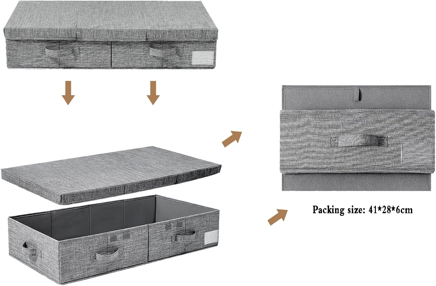 Name:Underbed storage box Product Category:Storage box Suitable for shoes, underwear, CDs, remote control, socks, jumpers, jewellery, magazines, stationery, etc. Storage scene: bedroom, living room, corner Material: Cotton, Paperboard Folding or not: Yes Wheel: No Portable: Yes Specification: as shown in the picture Style: modern simple Colour: Grey Function: foldable, multi-purpose, portable, movable, dustproof, moistureproof Quantity of product: 2,3,4 ♤Easy maneuverability: If you're looking for convenience and versatility, our under bed storage is the ideal choice. ♤Keep your bedroom clutter-free: Our under-bed clothes storage organizer provides the perfect solution for maximizing space and keeping your bedroom tidy. With its sturdy construction and ample storage capacity, you can neatly store away your seasonal clothing, bedding, and linens, keeping them dust-free and easily accessible. ♤Designed for durability: We understand that a storage solution needs to be reliable and long-lasting. That's why our under-bed storage is made from high-quality materials that can withstand daily use. The sturdy construction ensures it can handle heavy loads while maintaining its structural integrity, providing you with a practical and durable storage solution for years to come. It's a versatile and convenient option for any room. Note: - Please allow a measurement deviation of 1-2cm due to manual measurement. - The colors of the actual object may be a little different, due to the different display in the computer. Thanks for your understanding. - If you have any questions, please feel free to contact us as we have been here all along