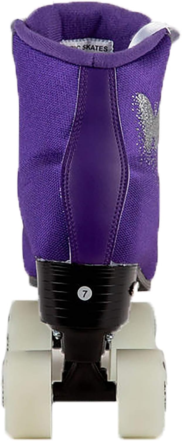 Epic Skates purple Butterfly Light-up Quad Roller Skates are super comfortable with a classic 3/4 cut boot. Packed with excitement, these quad skates include PU cast light-up wheels, white laces and pompoms. Put on your own “light show” as you cruise around the rink in these classically designed roller skates.