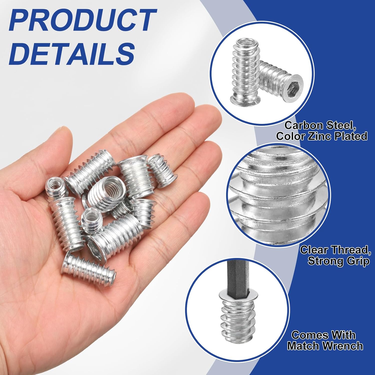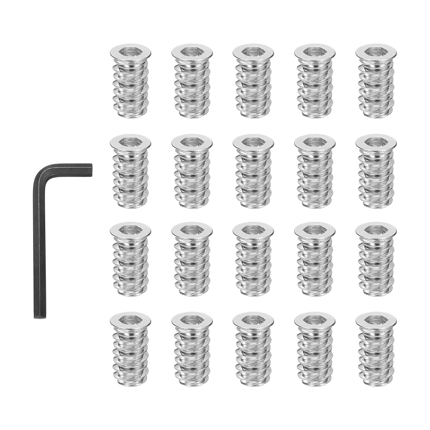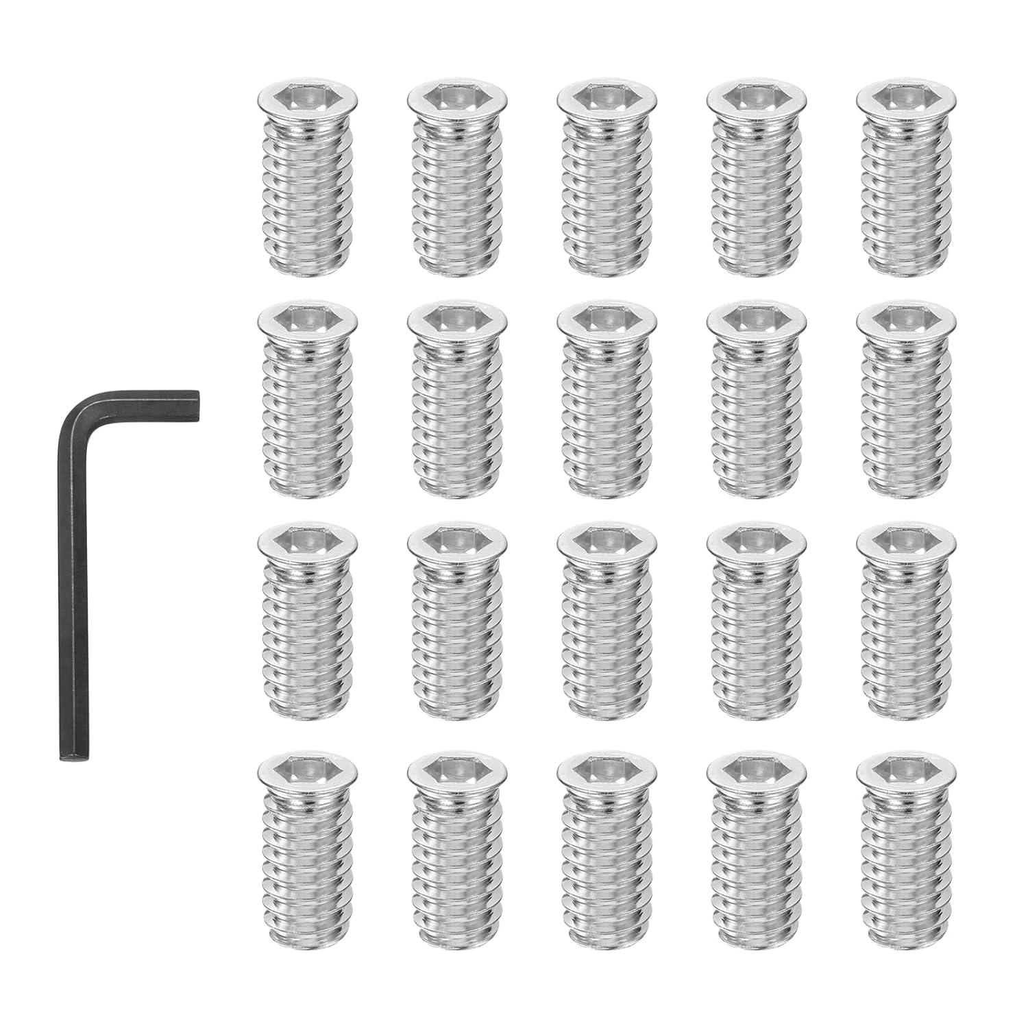 The insert nut is suitable for the connection and fastening of wood, plywood, and fiberboard. Great for home, workplace. Work for cabinets, sofas, office desks, dining tables or chairs, stairs, etc.SpecificationColor: SilverMaterial: Carbon SteelInternal Thread Dimension: 1/4-20(UNC)Head Diameter: 11.5 mm/ 0.45 InchExternal Thread Diameter: 10.5 mm/ 0.41 InchHeight: 10 mm/ 0.39 InchInner Hexagon Width Across Flats: 6 mm/ 0.24 InchInner Hexagon Wrench Size: 6 mm/ 0.24 InchPacking List: 20 Pcs x Spring Indexing PlungerAdvantageMaterial: Made of carbon steel, color zinc plated for corrosion resistance, high hardness, and wear resistance, ensuring that your projects are strong and durable.Feature: Hex socket design offers a stronger fastening force, ensuring secure and stable connections, less loosening or deformation, and providing vibration resistance.InstructionEasy installation: Just drill a hole of a suitable size and secure with the included hex key.NOTE: Please confirm the size before choosing our product.