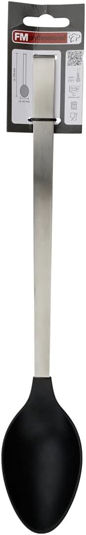FMprofessional serving spoon (quantity: 1 piece) The stainless steel serving spoon with functional plastic from FMprofessional is the ideal helper for stirring food in the saucepan and serving them. The robust kitchen aid with a length of approx. 35 cm is dishwasher safe and can be hung on a kitchen bar if required. FMprofessional kitchen aid from professionals for professionals. Size approx. 35 x 6.5 cm. Material: stainless steel and plastic. Colour: silver, black. Easy to clean. With the FMprofessional. Fackelmann has been offering a professional range of kitchen and gastronomic helpers for about ten years. To meet the high demands of professional users, all products are developed in cooperation with professionals. These include numerous chefs, gastronomers and associations as well as international market leaders in the distribution of kitchen and catering equipment.
